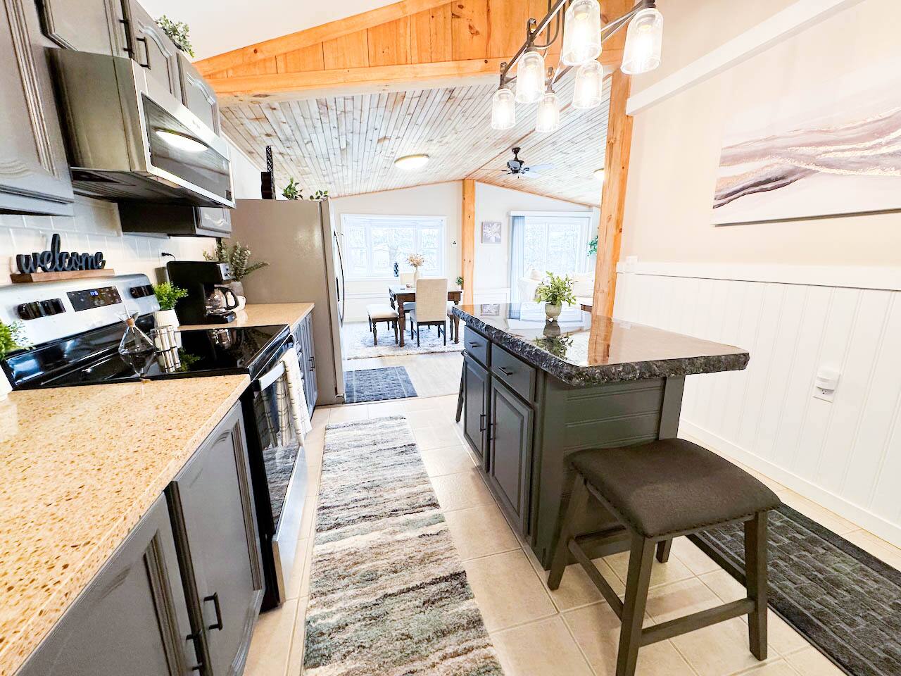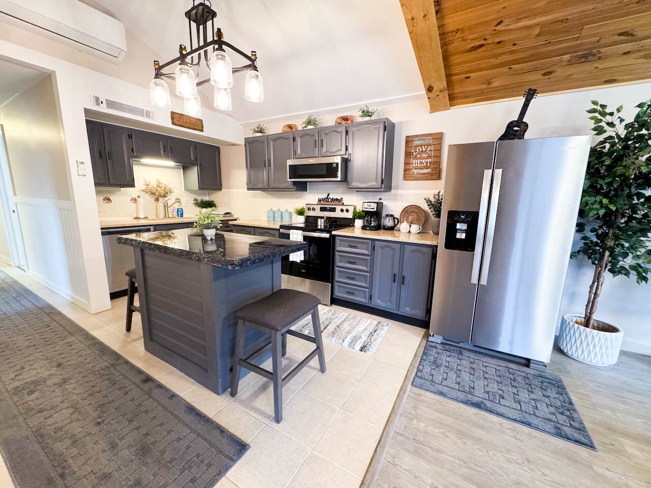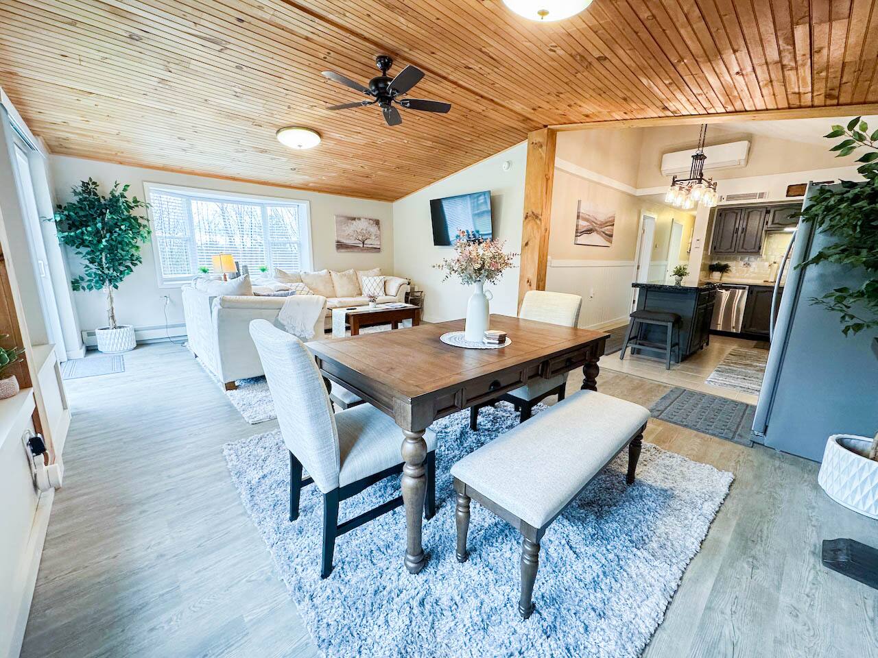 Welcome to your cozy countryside retreat! This fully renovated, single-level home offers comfort and convenience for guests of all ages. Each of the three bedrooms features brand-new mattresses and bedding, ensuring a restful stay. The kitchen is fully stocked with new kitchenware, and fresh towels are provided. Relax in the inviting living space, enjoy peaceful wooded views, or gather for a BBQ on the patio. Stay comfortable year-round with a new mini-split AC unit. Games included for extra fun!