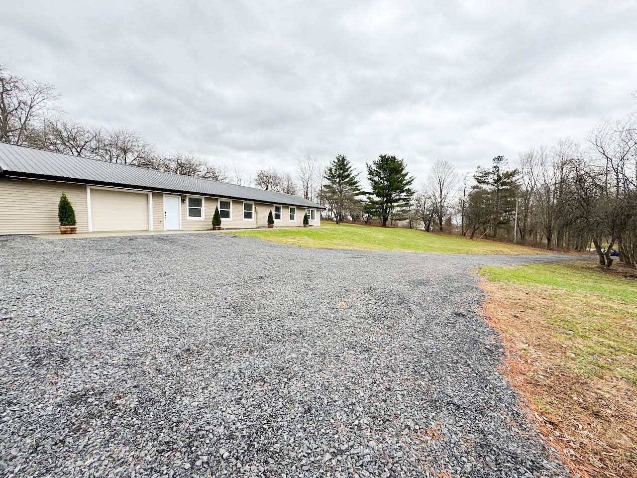 This home is perched on a peaceful hillside overlooking a tree-lined road, offering both privacy and convenience. Just a 7-minute drive to Cornell University and 12 minutes to downtown Ithaca, a car is essential for getting around. The house is accessed via a gently sloping gravel driveway, which is easy to navigate most of the year but may require snow tires in the snowiest winter months. Once at the top, guests will find ample parking for up to three cars right in front of the house.