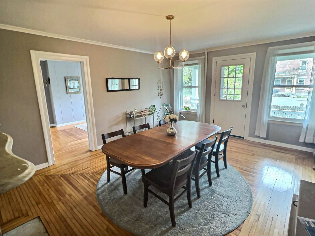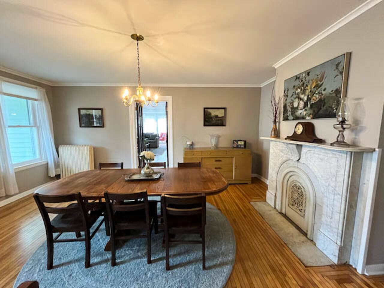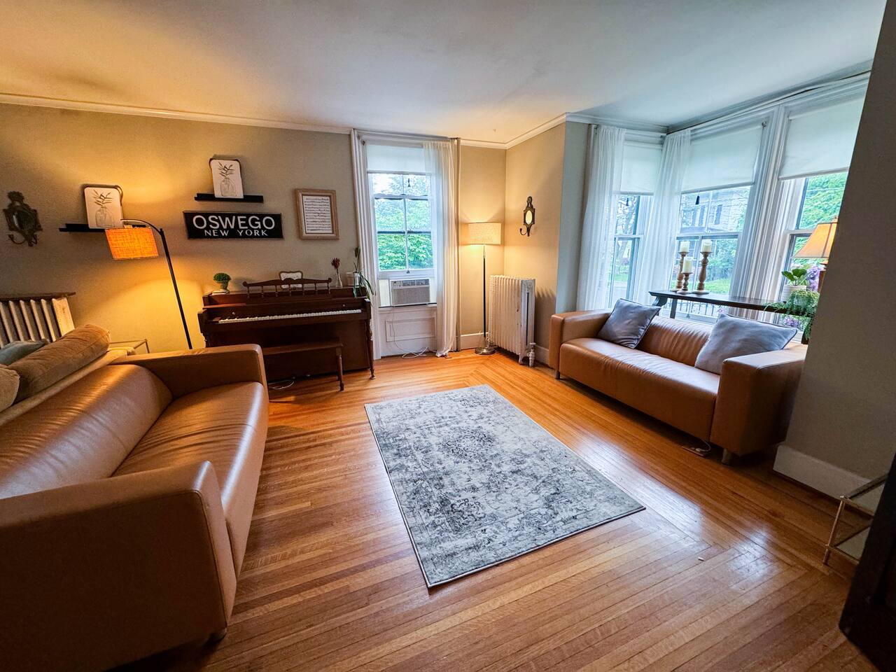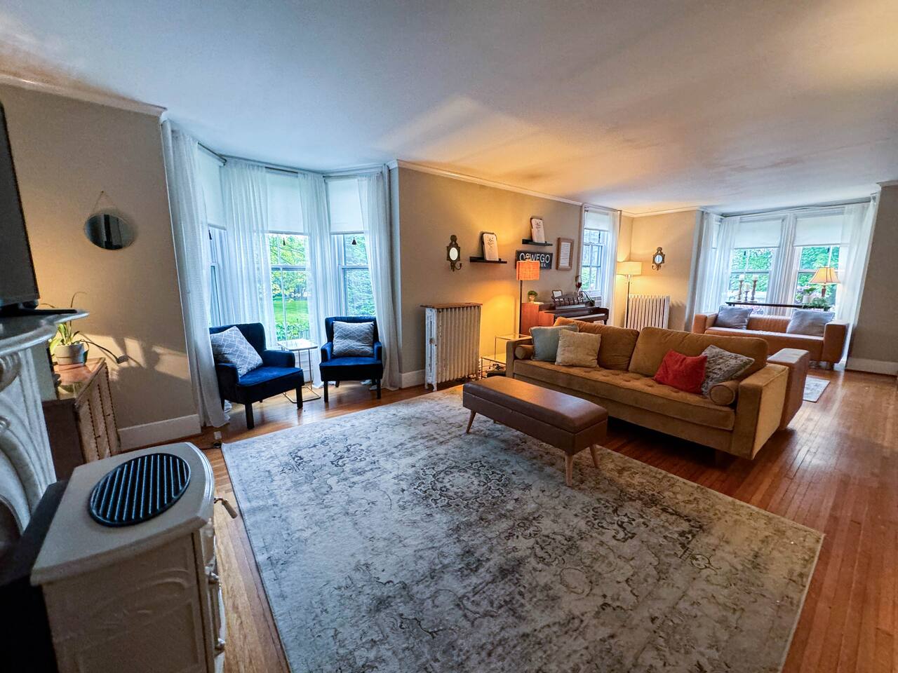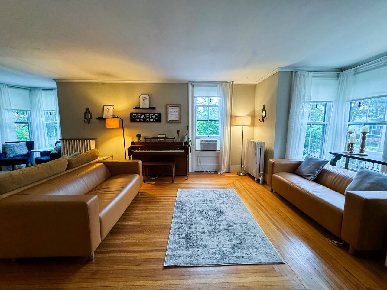 Welcome to our beautifully restored downtown Oswego historic home. This 6 bedroom 2.5 bath house 6 bedrooms. 1 king, 2 queens, 2 doubles and a twin bunkbed. We also have a pull out couch in the upstairs living room if needed. Original hardwood floors and many ornate details make this a memorable stay. The kitchen is stocked with everything you need for a short, or long stay. An easy walk to downtown, our historic home is perfect for an escape to Oswego's downtown. Close to the river and lake, you can walk to many restaurants, shops, and parks this house is a perfect place for your extended family to gather. Enjoy some of the features of this home: vintage record collection, natural gas fireplace, curated and eclectic furniture, carefully selected linens and mattresses. Back deck with hammock, propane grill, and outdoor table with umbrella make this a sweet place to eat breakfast or enjoy some fresh air. Basketball hoop on the driveway is a perfect place to enjoy some down time with friends/families.
