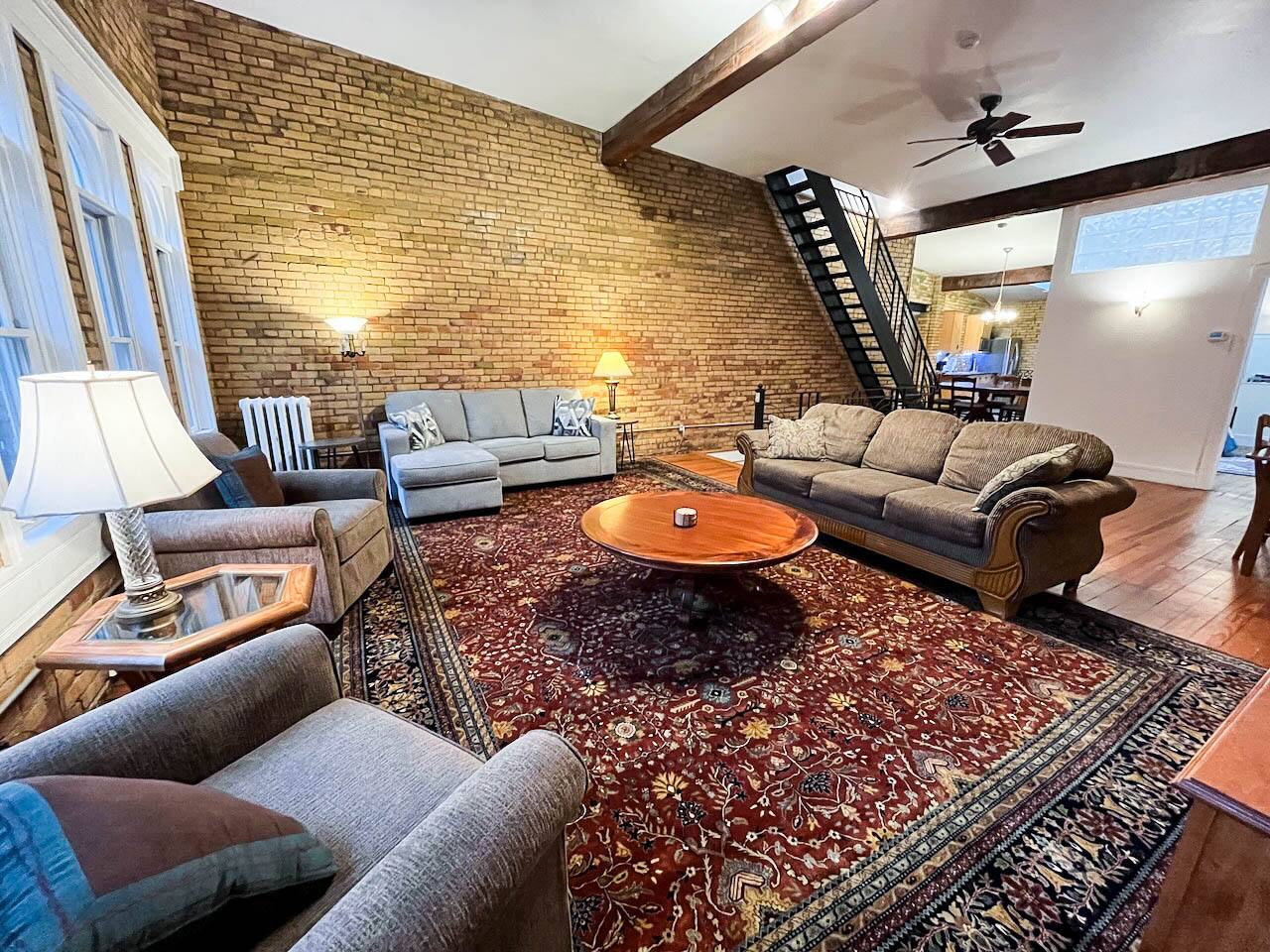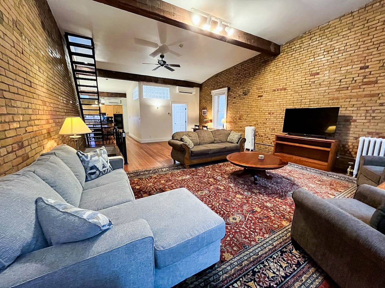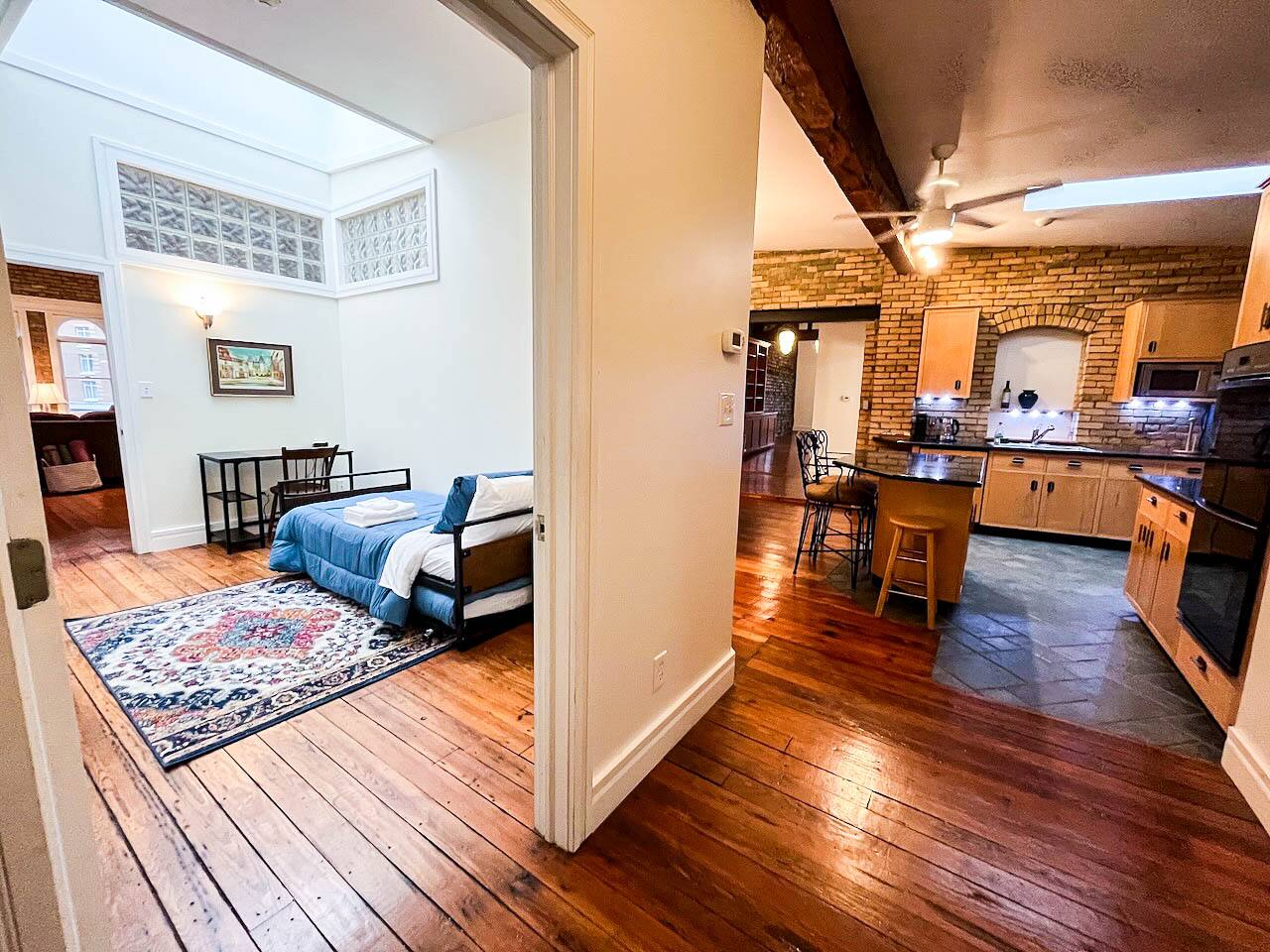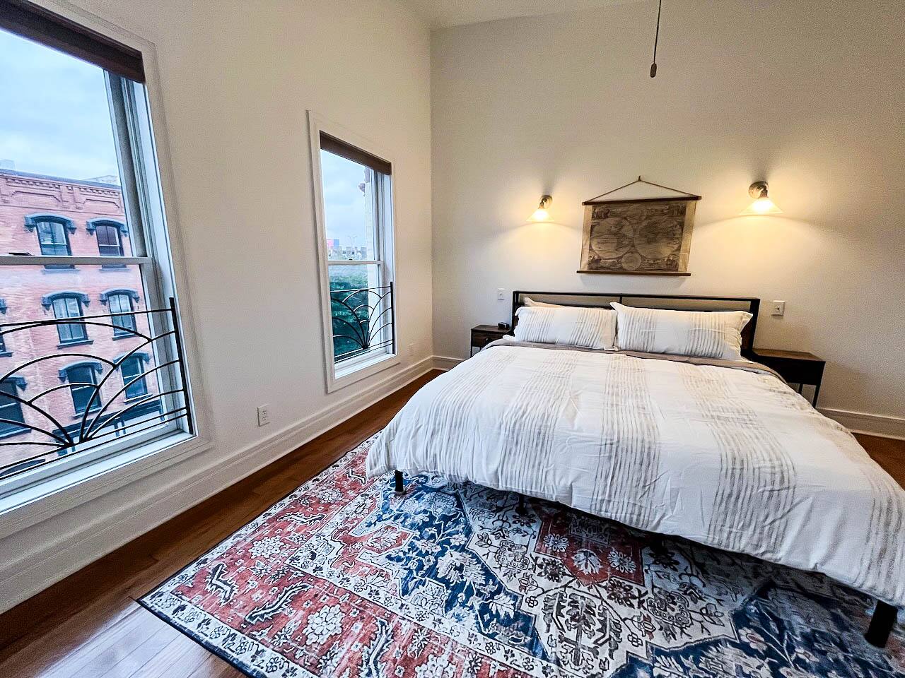 Welcome to our charming 4th-floor apartment. Nestled within, you'll find an expansive retreat boasting airy ceilings and rustic brick walls that lend an authentic touch to the space. Step into the heart of the home – an open kitchen that has been stocked with all the things you need for quick meals, afternoon coffee, or evening cocktails. Three inviting bedrooms: 1 kind sized bedroom, 1 queen bedroom that attaches to a bathroom, and a bedroom with a twin bed and bonus twin trundle bed. Two thoughtfully designed bathrooms await your choice of indulgence. Immerse yourself in relaxation with a soak in the jetted bathtub, or opt for the refreshing stand-up shower. As day turns into night, bask in the serenity of this spacious sanctuary, the perfect base for your adventures. Here, the 4th floor becomes a vantage point to both urban allure and peaceful reprieve, promising a unique sojourn that transcends ordinary stays. City of Ithaca STR-25-77