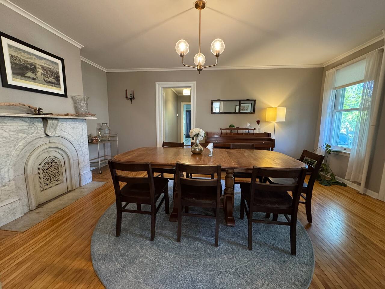 Welcome to our 1st floor downtown Oswego historic home. This 3 bedroom 1.5 bath apartment has 1 double bed, 1 queen bed, and a twin bunkbed. Original hardwood floors and other ornate details make this a memorable stay. The kitchen is stocked with everything you need for a short, or long stay. An easy walk to downtown, our historic home is perfect for an escape to Oswego's downtown. Close to the river and lake, you can walk to many restaurants, shops, and parks.